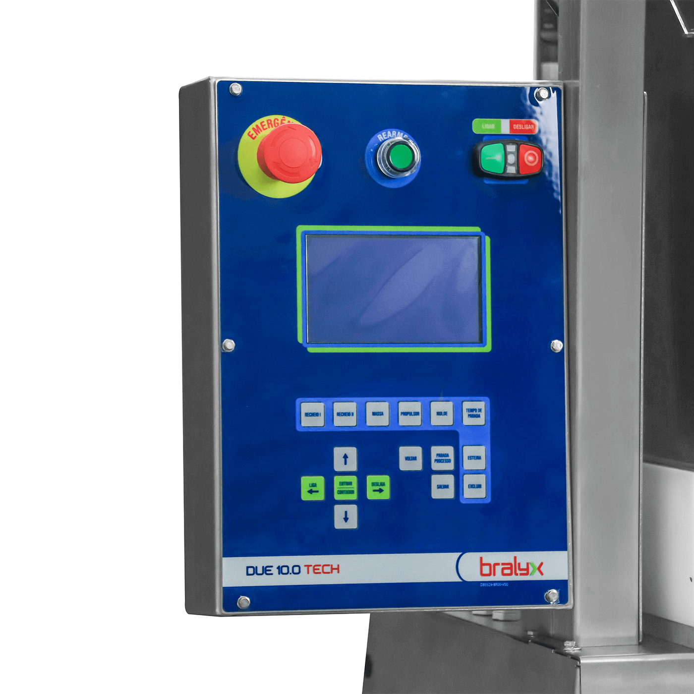 Desarrollada con materiales y componentes de altísima calidad, la DUE TECH no solo eleva los estándares de productividad, sino que también garantiza la durabilidad y eficiencia que esperas de una máquina Bralyx. Su exclusivo computador a bordo con teclado inteligente y amigable, junto con la pantalla del panel, agiliza el manejo, la programación de recetas y el control de las cantidades producidas. Esta tecnología digital exclusiva de Bralyx ofrece una ventaja significativa sobre los sistemas analógicos tradicionales, permitiendo la selección rápida de la receta para una operación inmediata, con instrucciones claras en la pantalla del panel y teclas de ajuste fino para mayor precisión en el tamaño y cantidad de masa y relleno.